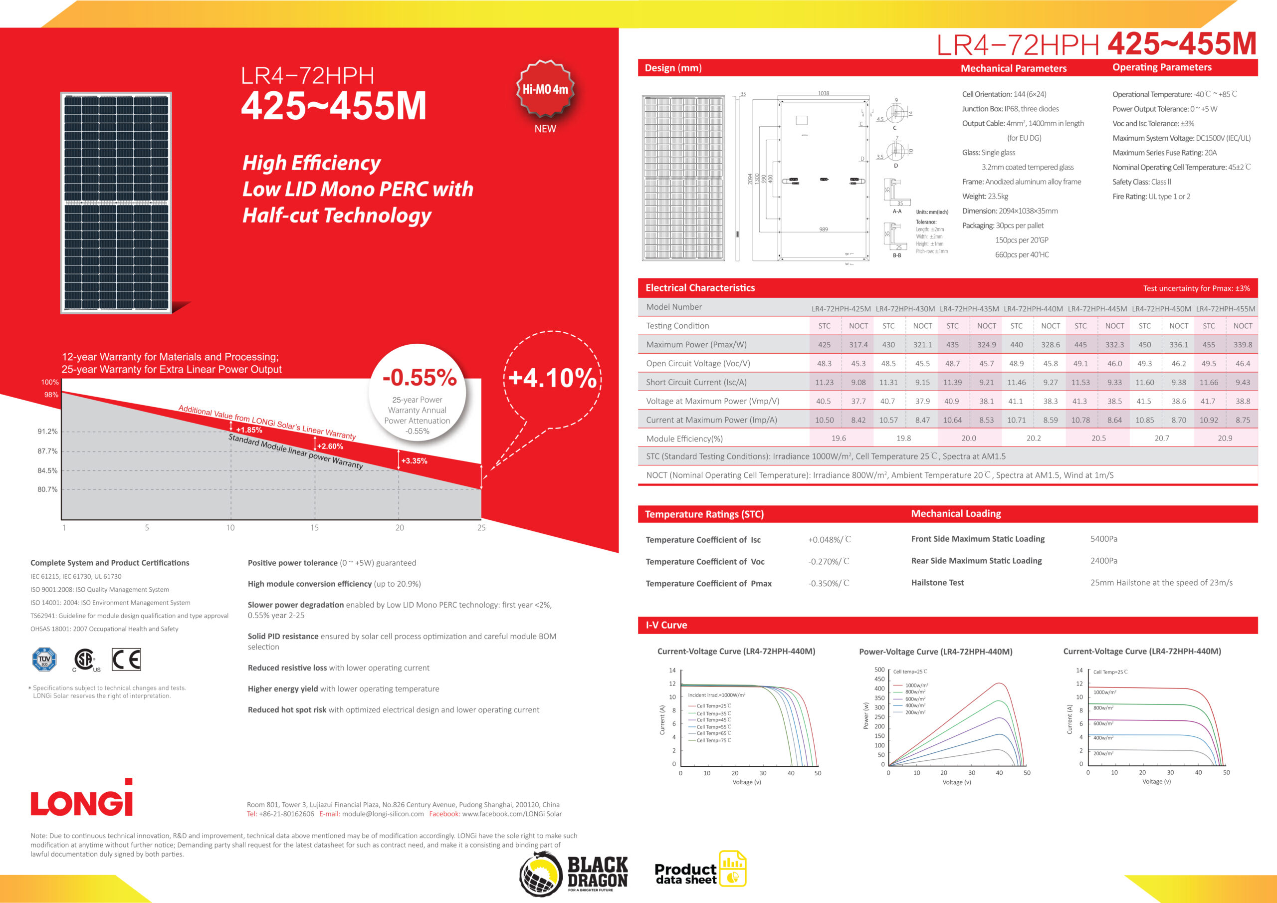 The LR4-72HPH 425-455M module by LONGi, offered through Black Dragon Solar Solutions, is a high-efficiency solar panel designed with Low LID Mono PERC technology and half-cut cell technology. This module is capable of delivering a power output range between 425 to 455 watts, making it an excellent choice for various solar installations. The module is engineered to provide a positive power tolerance of 0 to +5 watts, ensuring consistent and reliable performance.
