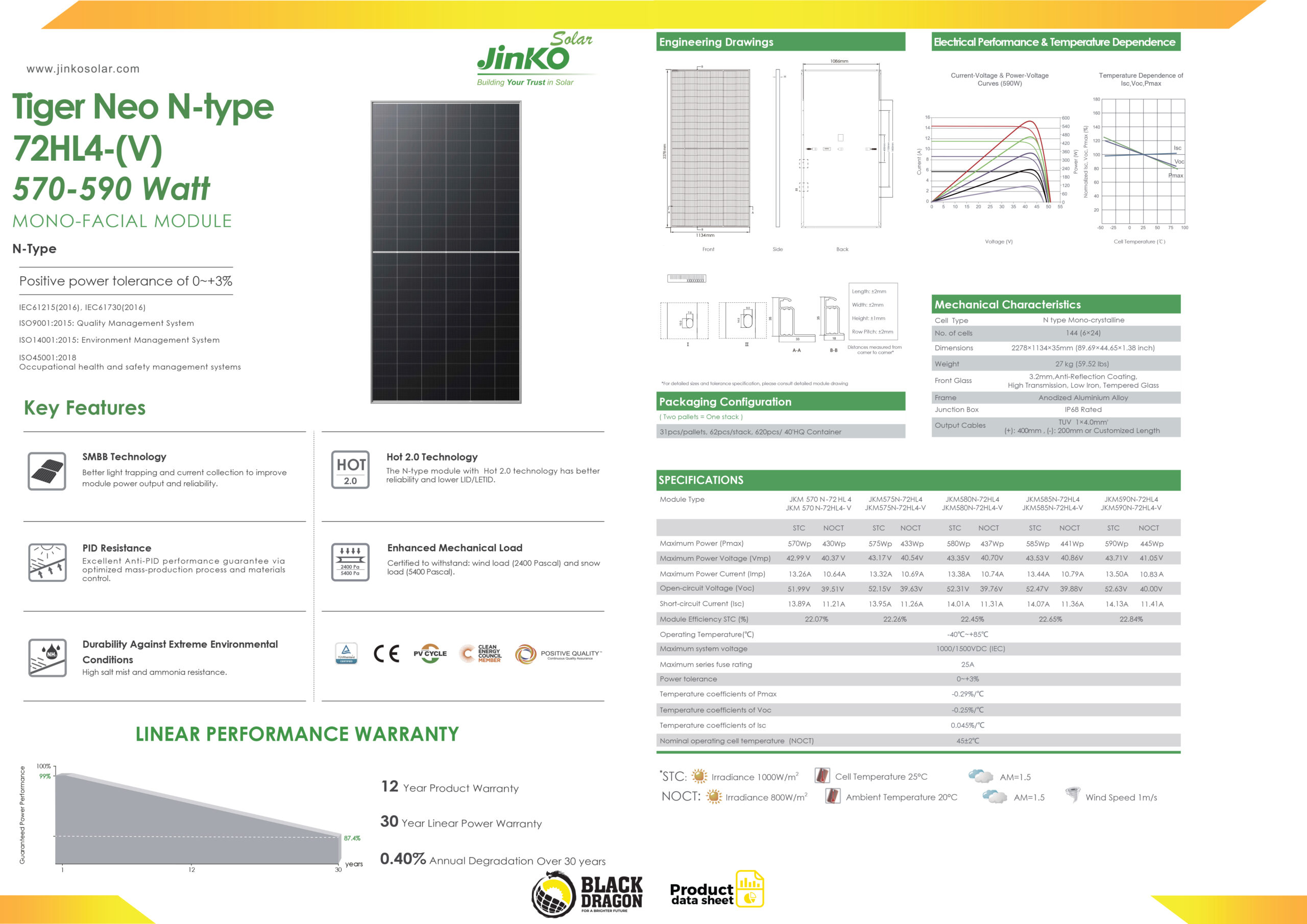 Black Dragon Solar Solutions offers the advanced Tiger Neo N-type 72HL4-(V) mono-facial solar module, delivering high efficiency with a power output range of 570 to 590 watts. This module utilizes cutting-edge N-type monocrystalline technology, ensuring reliable performance and long-lasting durability. The integration of SMB8 technology enhances light capture and current collection, thereby improving overall module efficiency and power output. Additionally, the Hot 2.0 technology minimizes light-induced degradation (LID), ensuring stable and consistent power production over the module’s lifespan.